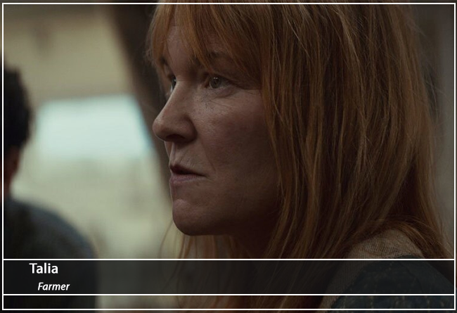 Elsewhere on Mina-Rau, B2EMO has a playful game with an astromech droid. Several local villagers, including Talia, pack up for the evening. The camera follows Bix Caleen walking through a field of grain. She is carrying a baby in her arms. As the baby coos, she looks to the horizon and comforts it. Caleen gazes at the blue-grey sky.