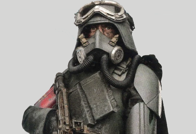 Equipment: E-10 blaster rifle (5D), Imperial Swamptrooper Armor (+2 vs Energy, +1D vs Physical), Oxygen Filter Mask, Grenades (5D), Utility Belt, Helmet Comlink
