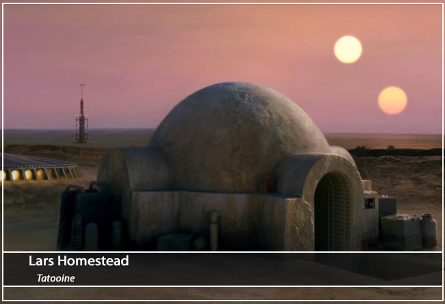 On Tatooine, Obi-Wan brings Luke to his new family: his uncle, Owen, and his aunt, Beru. Obi-Wan leaves on an eopie, heading to his exile in the Jundland Wastes. Owen and Beru, holding the infant Luke, look out to the horizon and watch the setting of Tatooine’s twin suns.