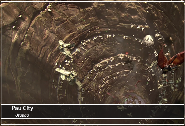 Obi-Wan arrives in Pau City on Utapau, and begins his search for General Grievous, riding a varactyl named Boga. He finds Grievous on the Tenth Level.