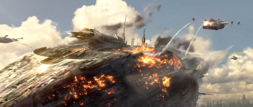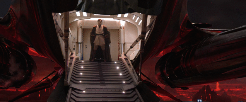 An explosion occurs deep in the ship, brought on by the attack of the Jedi Star cruiser, causing the Invisible Hand to begin an uncontrolled descent into Coruscant. Despite Palpatine’s persuasions that he should leave the unconscious Obi-Wan, Anakin carries him on his back, and maneuvers through the ship with the Chancellor. Obi-Wan later regains consciousness.