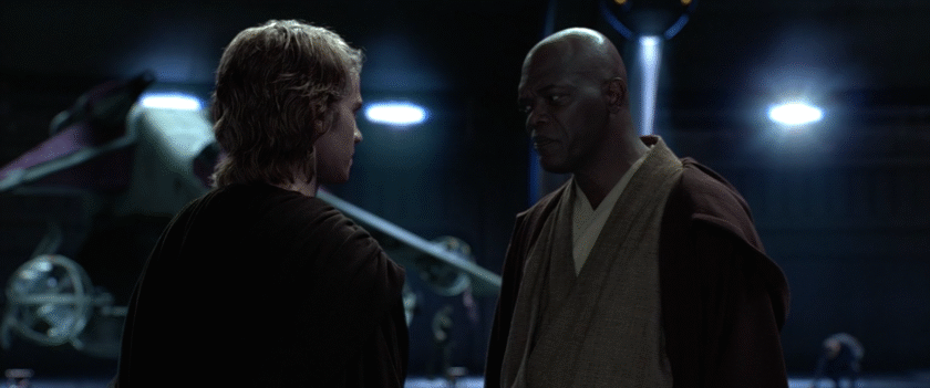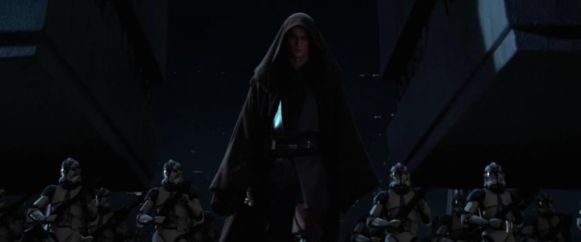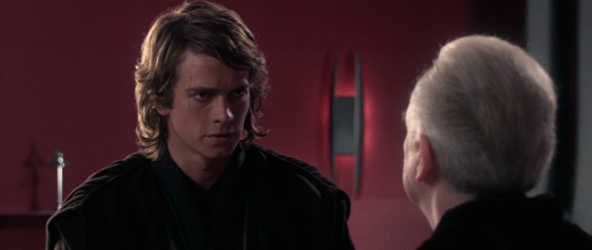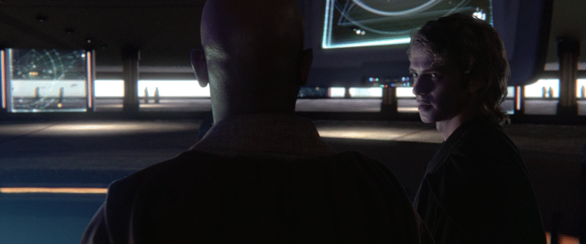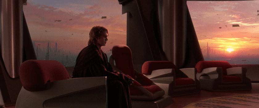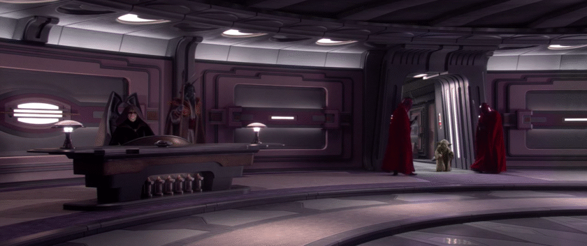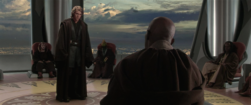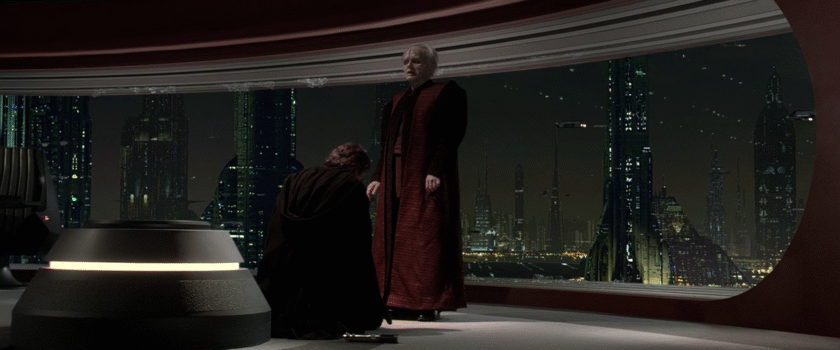 Sitting in the Council Chambers, remembering Palpatine’s promise of stopping death and the dreams of Padmé dying in childbirth, Anakin ruminates over his decision: in his mind, he hears Palpatine’s voice saying that if the Jedi kill him, any chance of saving Padmé will be lost. Finally, he leaves and rushes after the four Jedi.