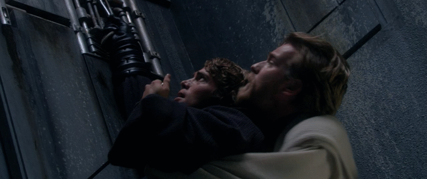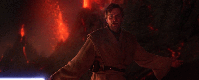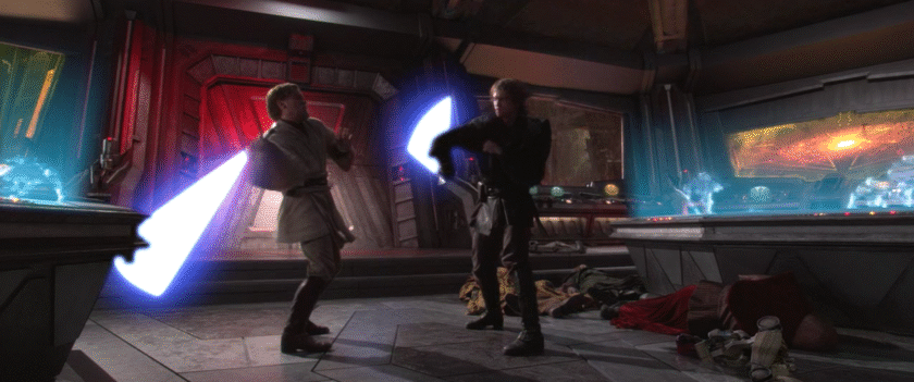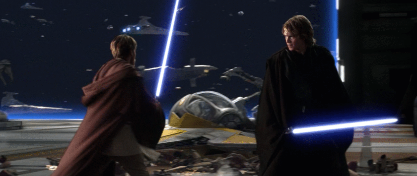On Mustafar, the duel between Obi-Wan and Vader continues, with Obi-Wan on the defensive. A missed slash from Vader’s lightsaber damages a computer console, deactivating the facility’s shields. As deadly lava falls all around them, they ride a collection arm severed from the main structure down the molten river below, which falls over a waterfall of lava. Abandoning the arm, Obi-Wan leaps onto a hovering mining platform below, with Vader pursuing him back up the lava river atop a collection droid. Obi-Wan appeals to his old friend one last time, but Vader still refuses to see reason, forcing Obi-Wan to accept that his student, friend, and brother is corrupted beyond redemption.