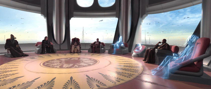 The High Council begrudgingly accepts Anakin’s appointment, but does not grant him the rank of Master. Anakin reacts angrily at this perceived slight, but is quickly shut down by Windu. Ignoring his outburst, the Council goes on to discuss matters concerning the war. It is decided that Anakin will be assigned to protect the Chancellor, and Yoda will take a battalion of clones to reinforce the Wookiees on Kashyyyk. Anakin is angry and disappointed.