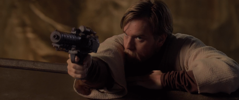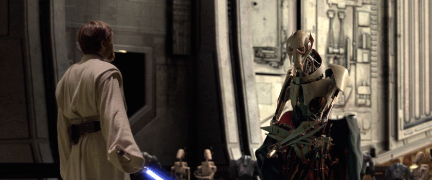 Obi-Wan continues to chase General Grievous on Utapau. He catches up with the General and jumps onto his wheel bike. Using Grievous’s electrostaff, he manages to destabilize the speeder, and it goes into a spin. Both Obi-Wan and Grievous are thrown off as the speeder topples over the edge of Grievous’s secret landing platform. Grievous then draws his blaster, though it is knocked from his hand by Obi-Wan, now wielding the electrostaff. He knocks Grievous down, and a brawl ensues, during which Kenobi tears open the General’s chest plates, revealing his living organs. Enraged, Grievous repeatedly hits Obi-Wan and then picks up the helpless Jedi and throws him over the edge. Obi-Wan barely manages to hang on and momentarily dangles for his life. As Grievous moves in for the kill, Obi-Wan uses the Force to retrieve the General’s blaster and fires at Grievous’s exposed organs. He hits, and they burst into flames. With his eyes flaming, Grievous falls to the floor, dead.