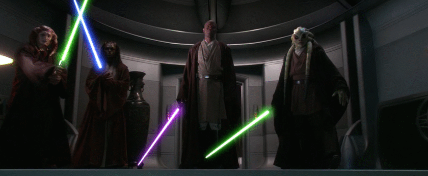 Windu and the three other Jedi Masters arrive at Chancellor Palpatine’s office. Windu declares Palpatine is under arrest and the Masters ignite their lightsabers. Sidious pulls a lightsaber from his sleeve and hurls himself at the Jedi with a screeching war cry. Kolar is the first to die, run through the chest and as Kolar’s life is ending due to the wound, Sidious turns and slices Tiin’s torso. A few seconds later, with more effort from Sidious, Fisto is slain, killed by a slash across the gut. Only Windu remains, alone against the Dark Lord.