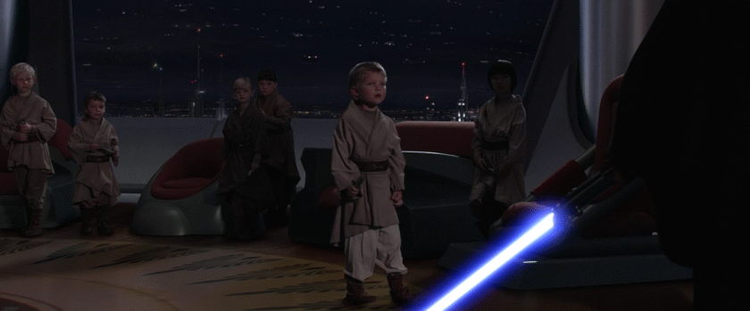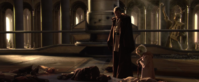 In the meantime, Obi-Wan and Yoda go to the Jedi Temple, slaying clone troopers and walking in disbelief through the carnage. Yoda notices that several of their fellow Jedi were cut down by a foe wielding a lightsaber. They recalibrate the Temple’s signal to warn all surviving Jedi to keep away from the Temple, but then Obi-Wan, wanting to know the truth, checks the security hologram recordings. To his horror, one recording shows Vader slaughtering a class of Jedi younglings and then kneeling before Sidious. Yoda says they must destroy the Sith, but Obi-Wan is reluctant to kill Vader and wants to go after the Emperor instead. Yoda, however, states that Obi-Wan is not strong enough to face Sidious and that Anakin is gone, “consumed” by Vader. Yoda sets out to confront Sidious, telling Obi-Wan to “use his feelings” to find Vader.