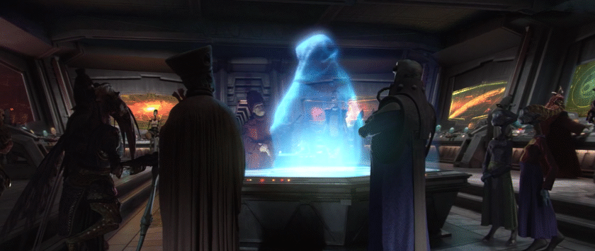 Later, in a meeting with the Jedi Council, Anakin relays the information about Grievous, explaining that a partial message was intercepted in a diplomatic packet from the Chairman of Utapau. Yoda says they should act quickly and decisively on this information. When Anakin expresses his interest in going at Palpatine’s request, Mace Windu harshly tells him that the Council will decide who goes and not the Chancellor. Yoda believes that a Master with more experience is needed to confront, and defeat, Grievous. Ki-Adi-Mundi agrees and nominates Obi-Wan to go. With the nomination agreed on, the Council adjourns and Obi-Wan prepares to go to Utapau.