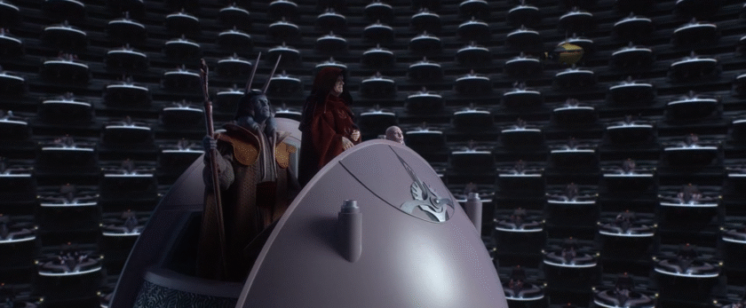 At the Galaxies Opera House in the Uscru District, Anakin joins Palpatine in watching the Mon Calamari Aquatic Ballet performing Squid Lake. Palpatine tells Anakin Clone Intelligence has located General Grievous hiding in the Utapau system. Anakin is delighted by this news, as Grievous’s capture will accelerate the war’s end. Palpatine remarks that he’d question the competence of the Jedi Council if Anakin was not sent on the mission. Inviting Anakin to join him, Palpatine dismisses his aides: once they are gone, Palpatine seduces Anakin to the dark side. He also tells Anakin that the Jedi Order wishes to overthrow the Republic and that if he has suspected it, Anakin must surely have sensed it. Anakin confirms that the Jedi don’t trust him, a fact that Palpatine expands to include the Senate, the Republic, and democracy as a whole. Anakin tells Palpatine that his trust in the Jedi has been shaken and Palpatine deduces Anakin’s distaste for the Council’s mission to spy on the Chancellor. Palpatine takes Anakin back to some of the early political lessons Palpatine tried to teach him, about how all those who gain power are afraid to lose it and that includes the Jedi. Anakin tries to defend the Jedi by saying they use their powers for good, but Palpatine argues good is only a point of view, noting that in almost every conceivable manner, including a quest for greater power, the Sith and the Jedi are exactly alike. Anakin disagrees, remarking that the Sith depend on passion for strength, thinking only of themselves, whereas the Jedi are selfless, thinking only of others.