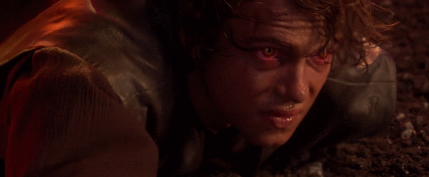 As Obi-Wan watches, Vader, helpless and now fully consumed by the dark side, tries in vain to pull his crippled, smoking body up the embankment with his one remaining mechanical arm. Obi-Wan is overcome with disgust and sadness at the pitiful fate of “The Chosen One,” and is reduced nearly to tears. He angrily shouts that Vader has failed in his life and destiny, and has hurt all those who loved him, including Obi-Wan himself. All Vader can do is scream in pain and powerless rage, cursing his former friend and Master. The lava below Vader then catches his leg, setting him on fire, horribly burning and disfiguring him, with Obi-Wan unable to help him or kill him. After briefly staring at the charred, mutilated figure that was once Anakin Skywalker, Obi-Wan turns and walks away, taking Anakin’s dropped lightsaber with him. He returns to the star skiff and leaves the planet with the unconscious Padmé and her droids.