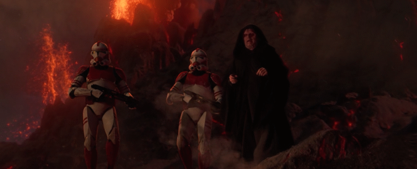 After fending off another attack from Vader, Obi-Wan disengages as the platform nears the shore of the lava river, leaping up onto the black sand bank. Obi-Wan warns Vader that he now holds an unassailable position, but Vader, enraged and bloodthirsty, yells “You underestimate my power!” and foolishly leaps up to kill his old Master. With a swift sweep of his blade, Obi-Wan slices off Vader’s left arm and legs. Vader tumbles down the embankment and rolls to a stop at the edge of the river of lava.