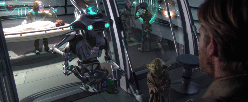 Obi-Wan arrives at Polis Massa with Padmé, who is given emergency medical treatment by the facility’s droids. She is dying, having lost the will to live. The medical droids work to save her babies—she has twins, much to the surprise of Bail Organa, Obi-Wan, and Yoda. A boy and a girl are born. In her last few dying breaths, Padmé gives them the names “Luke” and “Leia.”