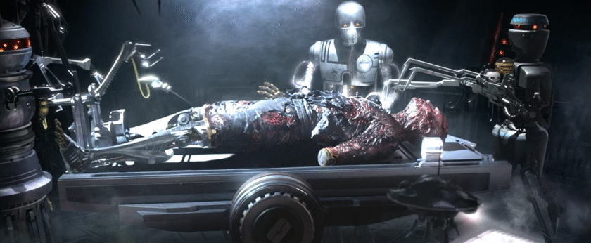 As his children are born, Vader is being rebuilt at the Grand Republic Medical Facility on Coruscant. Vader is given new legs, a new arm, mechanized lungs, and other “replacement parts.” He is dressed in black armor, a face mask is sealed tightly, and his helmet is fitted. Darth Vader begins to breathe through his mask. Most, if not the entire surgery is carried out in true dark-side form, with Vader wide awake and apparently unanesthetized, leaving him moaning, screaming, and writhing in excruciating agony.