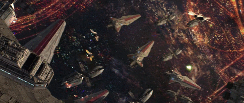 As the Separatist Droid Army attempts to escape the Galactic capital, a massive space battle erupts, into which race Jedi Master Obi-Wan Kenobi and his former padawan, now Jedi Knight Anakin Skywalker, leading a mission to rescue the Chancellor. The Jedi fight through the Separatist armada. In the process, Obi-Wan’s interceptor is damaged by buzz droids and his astromech, R4-P17, is destroyed. Anakin attempts to shoot the droids off, though succeeds only in blasting apart the wing of his former Master’s vessel. Obi-Wan tells Anakin to hold his fire as he’s not helping. Anakin agrees it was a bad idea. Obi-Wan tells Anakin to go on and rescue the Chancellor, but Anakin says he won’t leave without Obi-Wan. Anakin uses one of his fighter wings to knock some of the buzz droids off Obi-Wan’s fighter, but one manages to crawl onto Anakin’s ship although it is quickly disabled by R2-D2. As they approach Grievous’s flagship, Obi-Wan reminds Anakin their shields are still up, so Anakin breaks formation and attacks a shield generator, knocking out the shields on the docking bay of the ship. The two Jedi crash-land.