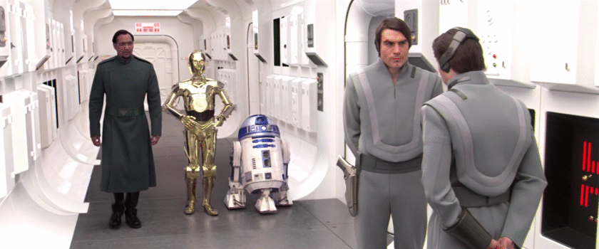 Bail Organa leaves R2-D2 and C-3PO in the care of Captain Raymus Antilles of the Tantive III. He orders a memory wipe of the talkative protocol droid.