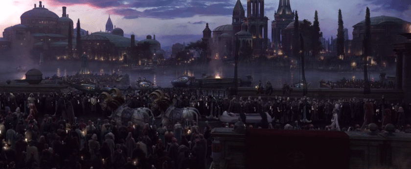 On Naboo, Padmé’s funeral takes place in a solemn ceremony in Theed. Her hands clasp the japor snippet given to her by Anakin following his departure from Tatooine some thirteen years ago. To protect her children, her body appears to still be pregnant.