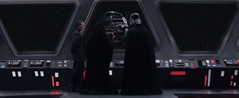 Yoda heads to Dagobah to begin his self-imposed exile, which he partly owes as penance for his failure to defeat Sidious. On the bridge of a gray-hulled Venator-class Star Destroyer, Vader, the Emperor, and Governor Wilhuff Tarkin oversee the construction of a moon-sized battle station.