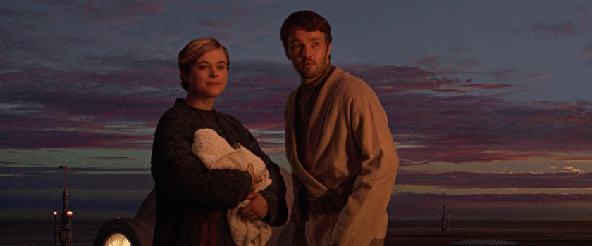 On Tatooine, Obi-Wan brings Luke to his new family: his uncle, Owen, and his aunt, Beru. Obi-Wan leaves on an eopie, heading to his exile in the Jundland Wastes. Owen and Beru, holding the infant Luke, look out to the horizon and watch the setting of Tatooine’s twin suns.