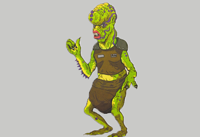 Background: A squat species with green skin, the Fluggrians had high foreheads which jutted forward over their face. A race of spindly limbs, each Fluggrian had three fingers on each hand ending in a large talon. Their skin was dotted with several sensory inputs in the form of purple spikes, which were capable of processing information at a high rate of speed. Large, square teeth filled their mouths and were hidden behind thick lips. Breathing through gill-like neck bands, the Fluggrians could breathe oxygen with ease.