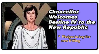 The New Republic’s newest member, Bespin IV, plans to spend 2.3% of its gross domestic product (GDP) on defense next year, its defense service stated to HoloNet News. Chancellor Mon Mothma welcomed its newest member during a defense hearing in the Galactic Capital. Full Story >>