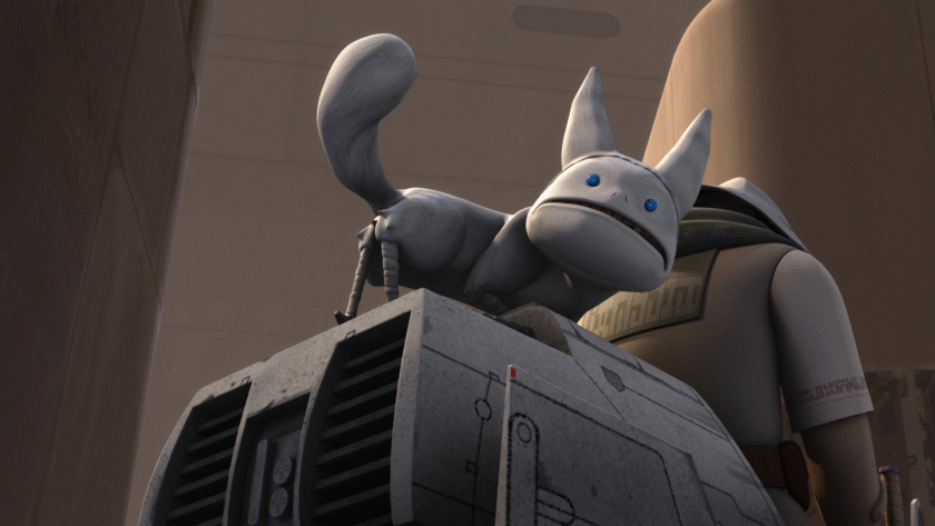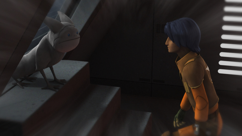 Meanwhile, the Phantom exits hyperspace above Lothal. Kanan expresses relief at not seeing any Star Destroyers above the planet for a change, and comforts Ezra by telling him that when he lost his master, he was alone, and he didn’t want Ezra to be. Upon landing in Capital City, Kanan and Ezra visit the Bridgers’ old home, which had been razed to the ground by the Empire. Meanwhile, Chopper stays aboard the Phantom. Ezra is upset, as he wonders where his parents could be if they’re not here. Just then, a white loth-cat, identical to the one in Ezra’s vision, emerges from the cellar. Ezra chases the cat through the streets of the city, before the animal escapes on the back of a speeder bike. However, Ezra informs Kanan that he can trace it, and then has to clarify that he planted a tracker on the animal. They follow the tracker’s signal to a spot in the wilderness, where they encounter the loth-cat and the speeder bike.