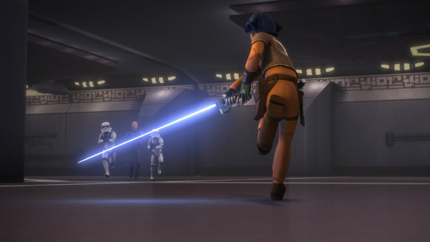 Zeb, in the marketplace, wonders what Hera was trying to tell him as the rebels’ comm signal is jammed. A blast door opens to reveal a large number of stormtroopers, answering Zeb’s question. Hera orders Sabine to splice the Empire’s jamming system while they wait for Zeb and Chopper to rejoin them, and Kanan and Ezra head off to assist Zeb and Chopper. Pursued by several stormtroopers, Zeb and Chopper take cover behind some crates, just as Kanan and Ezra come to their rescue. The rebels head farther down the hallway, but Chopper retreats to the original crates, having seen Agent Kallus and some stormtroopers arriving from the other direction, catching the rebels in a crossfire. Ezra snaps that they don’t have all day, and charges out of cover as Kanan calls after him. Igniting his lightsaber, Ezra charges at Kallus, taking out the two stormtroopers by deflecting their shots before Force pushing Kallus into a wall, knocking him out. Just then, the Fifth Brother and Seventh Sister arrive, and the Mirialan Inquisitor attempts to goad Ezra into attacking her. Ezra charges them, too, but Kanan shoots the control panel for the blast doors, closing them. Frustrated, Ezra snaps at Kanan that he doesn’t know what this is like, and Kanan agrees, telling Ezra that he never knew his parents. Ezra apologizes, and Kanan tells him it’s okay, as it’s too late for him, but maybe not for Ezra. Onboard the Ghost, Hera and Sabine manage to contact Commander Sato, who is calling Phoenix Squadron to report. He tells Hera that they are enacting Escape Plan Delta, and asks her if she’s ready. Seeing Kanan, Ezra, Zeb and Chopper running for the ship, pursued by stormtroopers, Hera responds that they are, and the Ghost takes off once everyone is aboard.