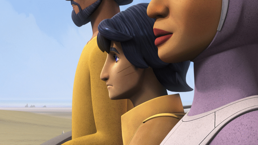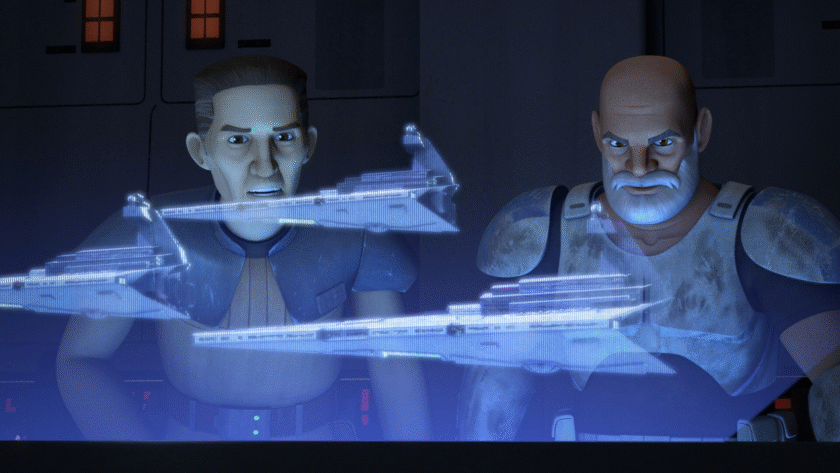 Hera orders Phoenix Squadron to angle their deflectors and follow her lead. Onboard the Relentless, Konstantine is told that several rebel ships are attempting to take off. A Taylander shuttle is shot down as the rebels evacuate. Kanan tells Ezra that if he wants to go to Lothal, they have to leave now, and the two of them and Chopper board the Phantom. Meanwhile, Zeb mans the Ghost’s upper turret and blasts a TIE fighter. Kanan detaches the Phantom from the Ghost, and shoots down another TIE. Konstantine orders his subordinates to target the rebel command ship with a tractor beam, snagging the Liberator, Commander Sato and Rex’s CR90 corvette. Hera orders Kanan and Ezra to leave, as she turns back to rescue the command ship. The Phantom and several other rebel ships flee. Sabine aims the ship’s proton torpedoes at the Relentless’ tractor beam projector, but the Ghost is knocked out of torpedo lock by fire from a TIE fighter. Hera then executes a dangerous maneuver to take out the Star Destroyer’s tractor beam, ramming the dish with the Ghost’s side, knocking it off and causing it to strike a pursuing TIE. The Ghost, the Liberator and the rest of the rebel ships escape into hyperspace. Sabine asks Hera whether they’re going to Lothal or staying with the fleet, and Hera responds that they’re sticking with the fleet. When one of Admiral Konstantine’s underlings reports that Agent Kallus would like to know the location of the rebel fleet, the Admiral responds that so would he.