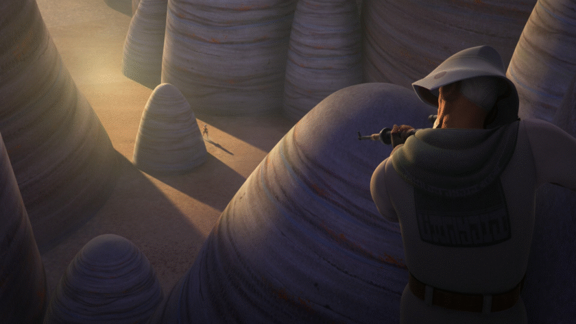 Immediately, Kanan and Ezra are forced to take cover when they are cornered by a helmeted figure, who fires at them. Ezra quickly recognizes the man as X-10, the prisoner from his Force vision, and asks him to stand down. When the man growls that “X-10” isn’t his name, mistaking his pursuers for bounty hunters, Ezra manages to placate the man by revealing that he is the son of Ephraim and Mira Bridger, suspecting that the man knows his parents. At this, the man removes his helmet and introduces himself as Ryder Azadi, confirming that he knows Ezra’s parents.