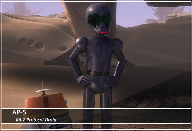 After the Ghost landed at the rebel base, Kanan attempted to make conversation with Hera but she was still uneasy about Kanan and Ezra’s plans to go away. Shortly later, Garazeb Orrelios and Chopper disembark from the Ghost. Upon arriving, Hera told the former Imperial inventory droid AP-5 that the crate containing the power generators had arrived. AP-5 grumbled that the shipment was due hours ago and asked Chopper whether the rebels were always late. The astromech droid squeaked an affirmative.