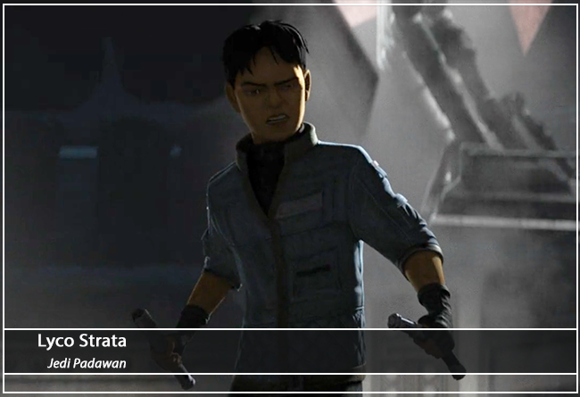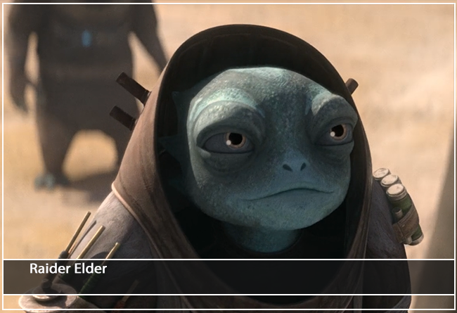 The old man is enraged to learn that Strata is a Jedi and levels his blaster at him. Ventress lowers his blaster and responds that Lyco is her friend. Strata looks to Ventress and smiles while the girl places her hand on her grandfather’s shoulder. A raiders steps forward and says that he is willing to talk if the old man agrees. Strata translates. The old man contemplates and decides to hand over his blaster to Ventress. He turns to the raiders’ leader and they share a look.