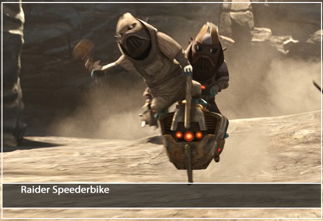 Before they can leave, the landspeeder breaks down. Ventress orders Strata to restart the vehicle while she and the girl stand guard. They sensed the ground quivering with movement. Just as Strata manages to restart the speeder, a gang of raiders riding speeder bikes reaches the edge of the ridge. At their leader’s signal, the horde of raiders descends down the ridge in their bikes. The trio flee on their speeder through the canyon.