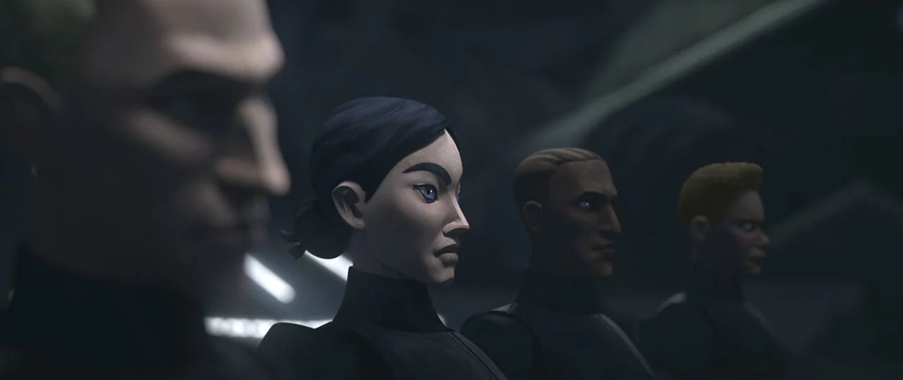 En route to the landing bay, Rampart tells Tarkin his vision of a large enlisted army for the Empire. Nala Se assures them that Kamino can provide enough clones for such a force, but Rampart insists that a combination of recruits trained by clones is the optimum strategy, one that Tarkin seems to support. In the landing bay, Rampart introduces Tarkin to the Empire’s first Elite Squad.