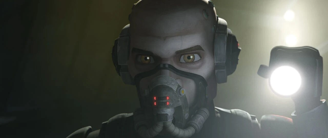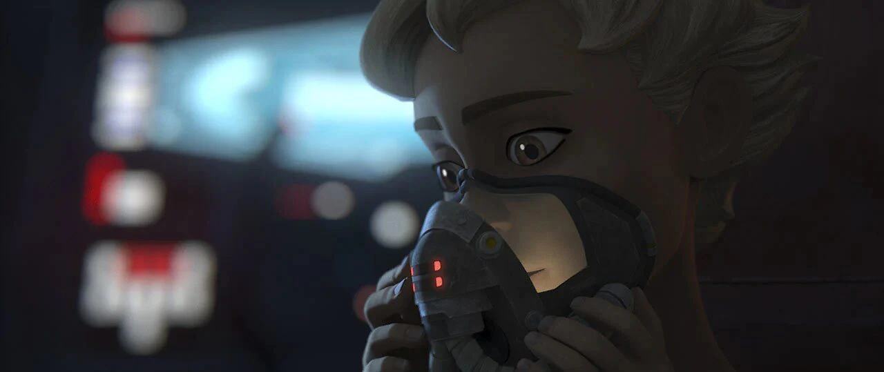 Hunter and Omega locate the capacitor, and as Hunter goes to retrieve it, the Ordo dragon knocks him over and runs away with the part again. Hunter turns, gasping for breath as his breath mask has been knocked off. Omega finds the mask and puts it back on, but Hunter is already unconscious. She tries to call for help, but the storm is disrupting the signal. Omega watches as the dragon climbs into a burrow. Taking a deep breath, she grabs Hunter’s blaster pistol and flashlight and slides down the burrow into a tunnel.