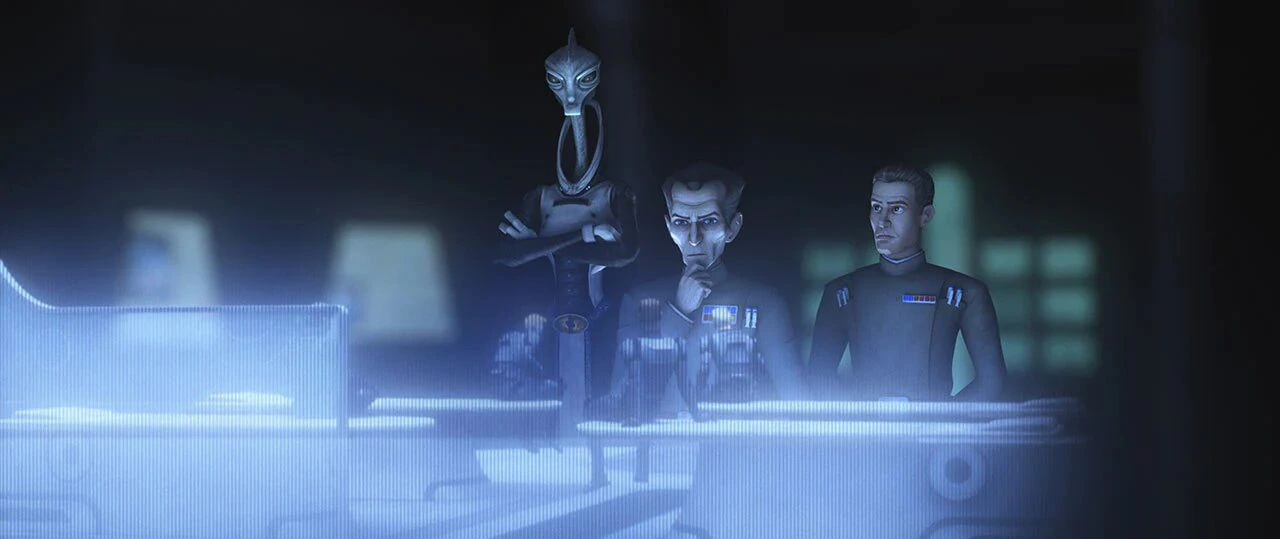 Tarkin, Rampart, and Prime Minister Lama Su watch the squad over a hologram. Lama Su says that enlisted recruits can never match the effectiveness of the clones, but Rampart disagrees, replying that skills can be taught and that the loyalty of those who willingly enlist is where the value lies. Tarkin calls for a tangible test of Rampart’s claims of ability and loyalty—he orders the Elite Squad to be deployed to Onderon, to locate and wipe out Saw Gerrera’s camp and to succeed where Clone Force 99 failed. Lama Su leaves the room, a look of deep concern on his face.