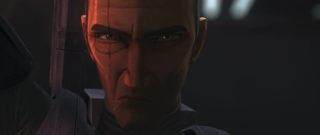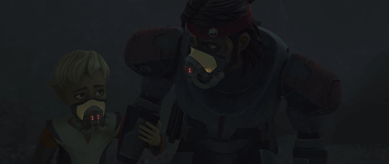 Hunter and Omega make their way across the moon’s surface. Hunter kneels down and examines some dust, and Omega asks what he is doing. Hunter replies he is tracking, and Omega asks if she can learn to track like him. Hunter tells her his ability is an enhanced skill, and that Wrecker and Tech each have a skill too. Omega adds “And Crosshair.” Hunter scowls and Omega tells him they shouldn’t be angry with him as he can’t help it. Hunter says and says he is angry with himself, for leaving one of his team behind, and Omega says they will find a way to get him back.