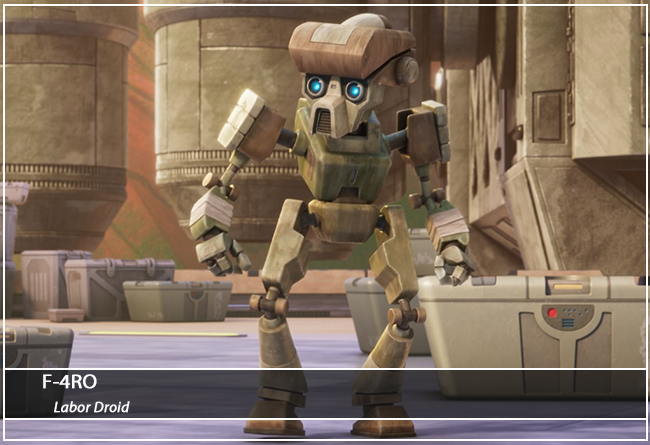 Brightstar wants to go back to the Tenoo Jedi Temple and rest, but Solay insists on finding something to do together. She sees a labor droid, F-4RO, in distress and goes to help it. Solay introduces herself and her friends to the droid. F-4RO reluctantly allows them to load a crate onto a hover cart and bring them aboard a starship. However, the younglings accidentally load a crate onto the wrong ship, which promptly takes off from Kublop Springs spaceport. F-4RO panics because the departing ship is heading to the pirate stronghold of Yarrum Tower and he fears the pirates will never give it back.