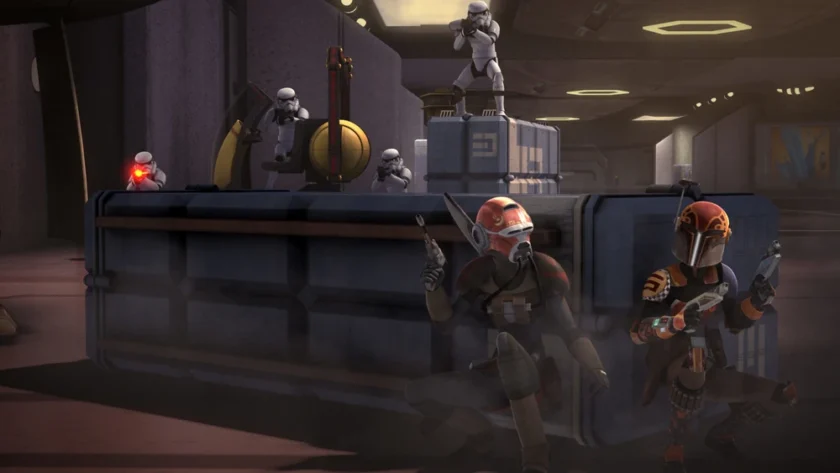 Brightstar ignores Vinik and restarts the course. He flies through the first sky ring without incident but flies too closely to a giant Tenoo tree. His Jedi Vector’s canopy is covered in leaves, which limit his vision. His starfighter is hit by a waterspout from the river, damaging the engines. Brightstar flies back to the launch pad When he remarks that Vinik made it look easy, Vinik explains that he is not perfect and scuffed one of his Vector’s wings while setting up the course yesterday.